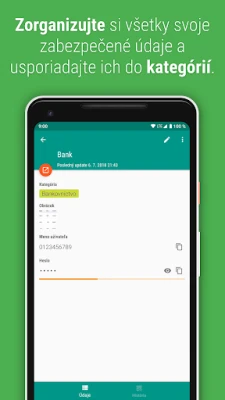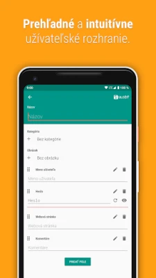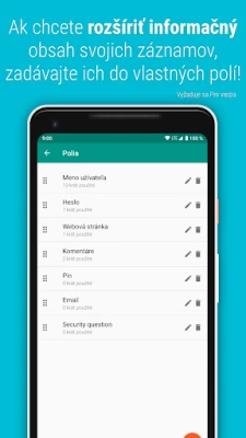 Intuitívne rozhranie aplikácie Bezpečné heslo vám umožní ľahko spravovať vaše záznamy. Vytvorte si vlastné kategórie na prehľadné usporiadanie všetkých položiek – od bankových účtov po sociálne siete. Prispôsobte si vzhľad aplikácie podľa vlastných preferencií a získajte cenný prehľad vďaka detailným štatistikám o vašich heslách, napríklad o ich sile či frekvencii používania. Bezpečné heslo nepožaduje žiadne zbytočné oprávnenia systému Android, čím podčiarkuje svoj záväzok k vašej absolútnej súkromnej sfére. Pre náročnejších používateľov sú k dispozícii rozšírené PRO funkcie, ako je prihlasovanie odtlačkom prsta, možnosť prikladania obrázkov k položkám, vytváranie vlastných vstupných polí či podrobná história hesiel. Aplikácia je navyše dostupná aj pre Wear OS, takže máte svoje údaje vždy poruke. Upozorňujeme: Pre maximálnu bezpečnosť sú všetky dáta šifrované takým spôsobom, že obnova informácií alebo reset hlavného hesla nie je možný v prípade jeho straty. Uchovávajte si ho preto v bezpečí.