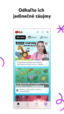 Každé dieťa je jedinečné, a preto si zaslúži obsah prispôsobený jeho vývojovej fáze. Rodičia môžu ľahko nastaviť individuálne profily s vlastnými obsahovými filtrami, čím zabezpečia, že deti uvidia len to najvhodnejšie. Či už ide o režim Predškoláci, ktorý podporuje základné vedomosti a zvedavosť, režim Mladšie deti pre milovníkov pesničiek a rozprávok, alebo režim Staršie deti s populárnou hudbou a herným obsahom – YouTube Kids sa prispôsobí potrebám vašich detí. Pre maximálnu kontrolu je k dispozícii aj režim Ručne schvaľovaný obsah, kde si sami vyberiete presné videá a kanály.